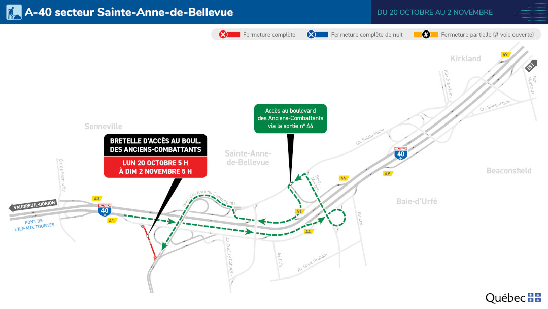- Fermeture complète de la sortie no 41 (Sainte-Anne-de-Bellevue, boulevard des Anciens-Combattants) de l’autoroute 40 en direction est. Un chemin de détour balisé sera mis en place par la sortie no 50 (boulevard St-Charles).