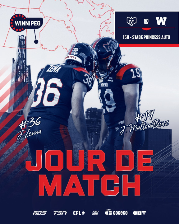 Les Alouettes de Montréal rendent visite aux Blue Bombers de Winnipeg à 15 h HE le samedi 25 oct. (RDS, TSN, CTV, CFL+, 985fm, TSN 690).