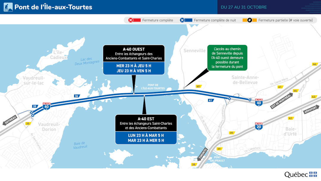 Le ministère des Transports et de la Mobilité durable informe la population que des fermetures de nuit seront mises en place sur le pont de l’Île-aux-Tourtes, reliant Senneville et Vaudreuil-Dorion dans l’axe de l’autoroute 40 (Félix-Leclerc), du 27 octobre au 4 novembre. Ces entraves sont requises pour remplacer des glissières sur la structure.