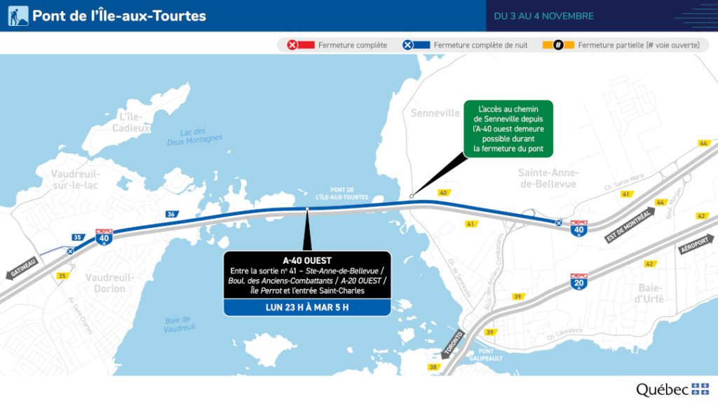 o La bretelle menant de l’autoroute 40 en direction est vers le pont de l’Île-aux- Tourtes sera fermée dans l’échangeur avec l’autoroute 30. Les usagers sont invités à privilégier les autoroutes 20 et 30. Le péage sur l’autoroute 30 sera d’ailleurs suspendu en direction est pendant ces entraves.
