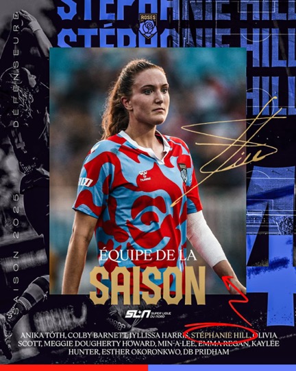 Les Roses de Montréal sont fières d’annoncer que la défenseure Stéphanie Hill a été sélectionnée dans l’Équipe de la saison de la Super Ligue du Nord (SLN), une distinction votée par les joueuses de la ligue.