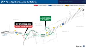 - Fermeture de la route 136 en direction ouest entre la sortie no 5 – A-10 / R-112 / Boul. R.-Bourassa / Pont Champlain / Pont Victoria et l’entrée en provenance de la rue du Fort. Détour : boulevard Robert-Bourassa, autoroute 10 (Bonaventure) en direction est, sortie no 4 et boulevard Gaétan-Laberge jusqu’à l’entrée vers l’autoroute 15 en direction nord.